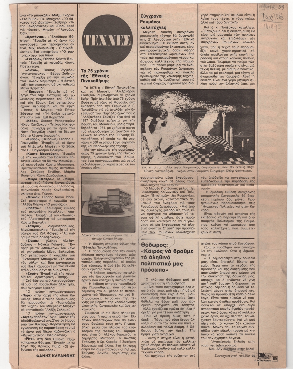 Απόκομμα εφημερίδας, χαρτί, 32,0×24,5 εκ., στα ελληνικά. Το δημοσίευμα αναφέρεται στην επικείμενη έκθεση σύγχρονης ρουμανικής τέχνης που διοργάνωσε η Εθνική Πινακοθήκη στην Αθήνα το 1975. Περιλαμβάνονται αποσπάσματα από το σημείωμα του Μιρσέα Ποπέσκου, μέλους της Ακαδημίας Κοινωνικών και Πολιτικών Επιστημών της Ρουμανίας. Εικονογραφείται με αναπαραγωγή έργου.