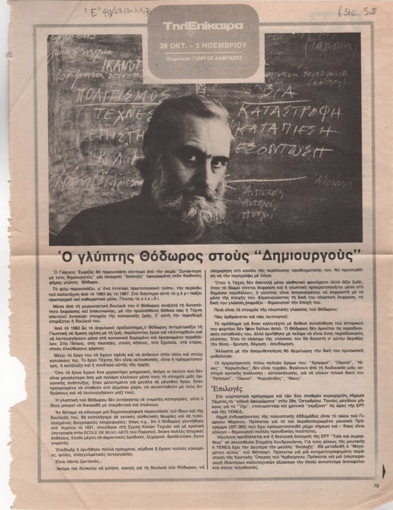 Απόκομμα περιοδικού, χαρτί, 32,0×22,0 εκ., στα ελληνικά. Κριτική της τηλεοπτικής εκπομπής-αφιέρωμα στο γλύπτη Θόδωρο από τη σειρά “Συνάντηση με τους Δημιουργούς” που προβλήθηκε στην ελληνική τηλεόραση. Εικονογραφείται με φωτογραφία του καλλιτέχνη. Επάνω επιγραφή.