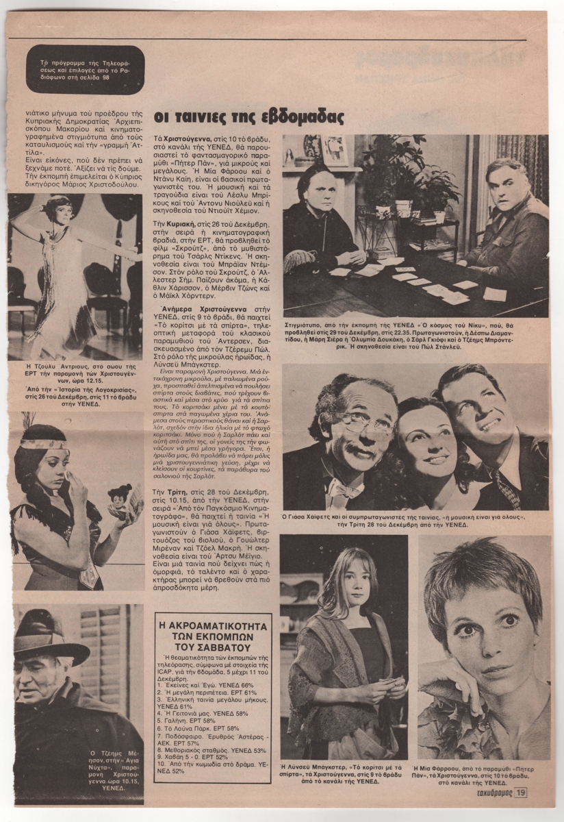 Απόκομμα περιοδικού, χαρτί, 32,0×22,0 εκ., στα ελληνικά. Τηλεοπτική επικαιρότητα των Χριστουγέννων του 1976. Παρουσιάζεται το πρόγραμμα των κρατικών καναλιών. Το δημοσίευμα εικονογραφείται με φωτογραφίες από τις ταινίες: “Άγια Νύχτα”, “Ο κόσμος του Νίκυ”, “Η μουσική είναι για όλους”, “Το κορίτσι με τα σπίρτα” και “Πήτερ Παν”.
