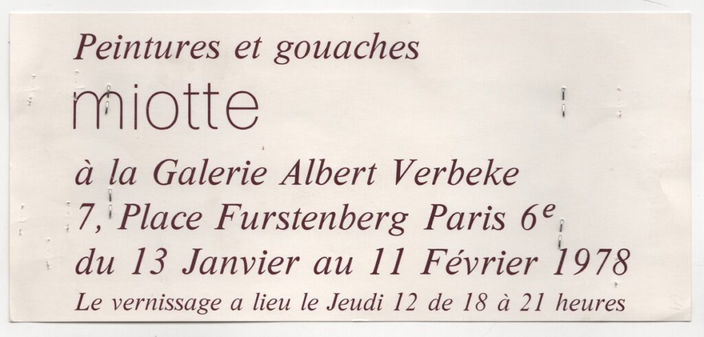 Έντυπο, μονόφυλλο, χαρτόνι, 9,78×22,0 εκ., στα γαλλικά. Πρόσκληση ατομική έκθεσης ζωγραφικής του Jean Miotte στο Παρίσι το 1978.