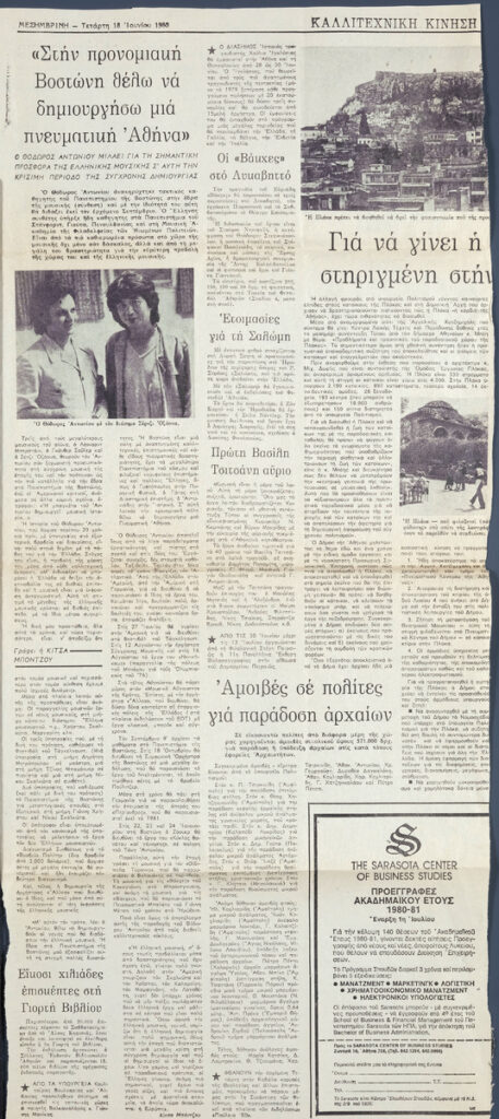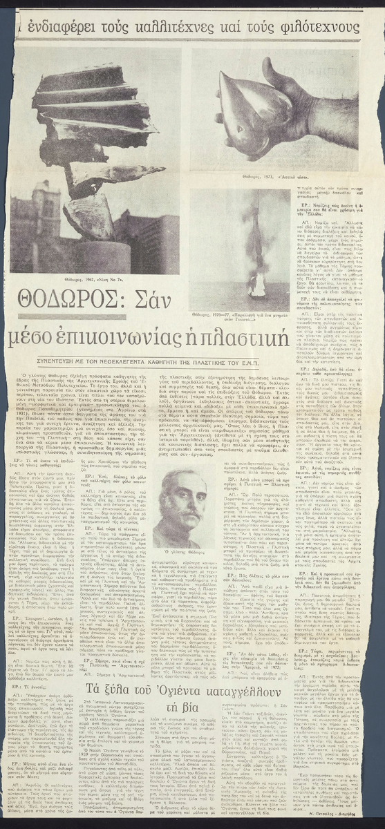 Απόκομμα της εφημερίδας “Μεσημβρινή” (18/06/1980), όπου δημοσιεύεται συνέντευξη του γλύπτη Θόδωρου στον Ν. Πετσάλη-Διομήδη με αφορμή την εκλογή του καλλιτέχνη ως καθηγητή της έδρας της Πλαστικής της Αρχιτεκτονικής Σχολής του Εθνικού Μετσόβιου Πολυτεχνείου.