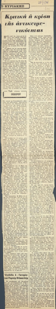 Απόκομμα της εφημερίδας “Το Βήμα” (27/01/1974). Κείμενο του γλύπτη Θόδωρου για την σχέση της καλλιτεχνικής δημιουργίας με την υποδοχή της από το ευρύ κοινό.