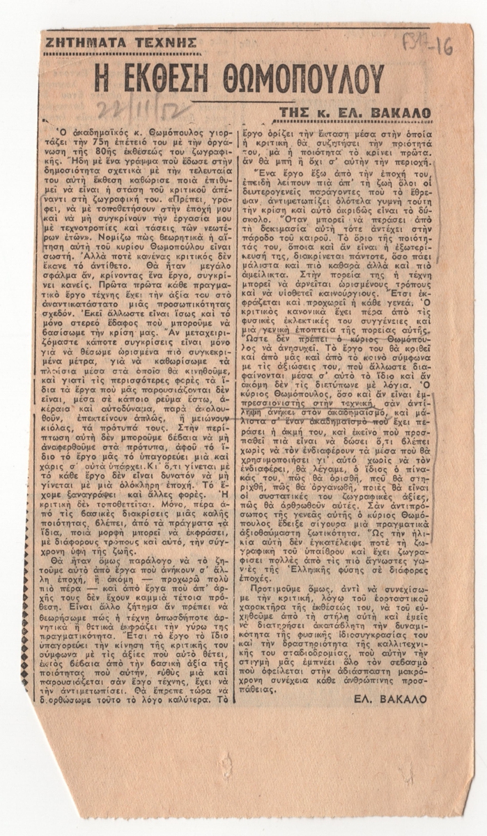 Απόκομμα, έντυπο, στα ελληνικά, χαρτί, 19,0×11,0 εκ. Κριτική της Ελένης Βακαλό για την έκθεση ζωγραφικής του Επαμεινώνδα Θωμόπουλου στην Αθήνα το 1952. Κάτω από τον τίτλο επιγραφή.
