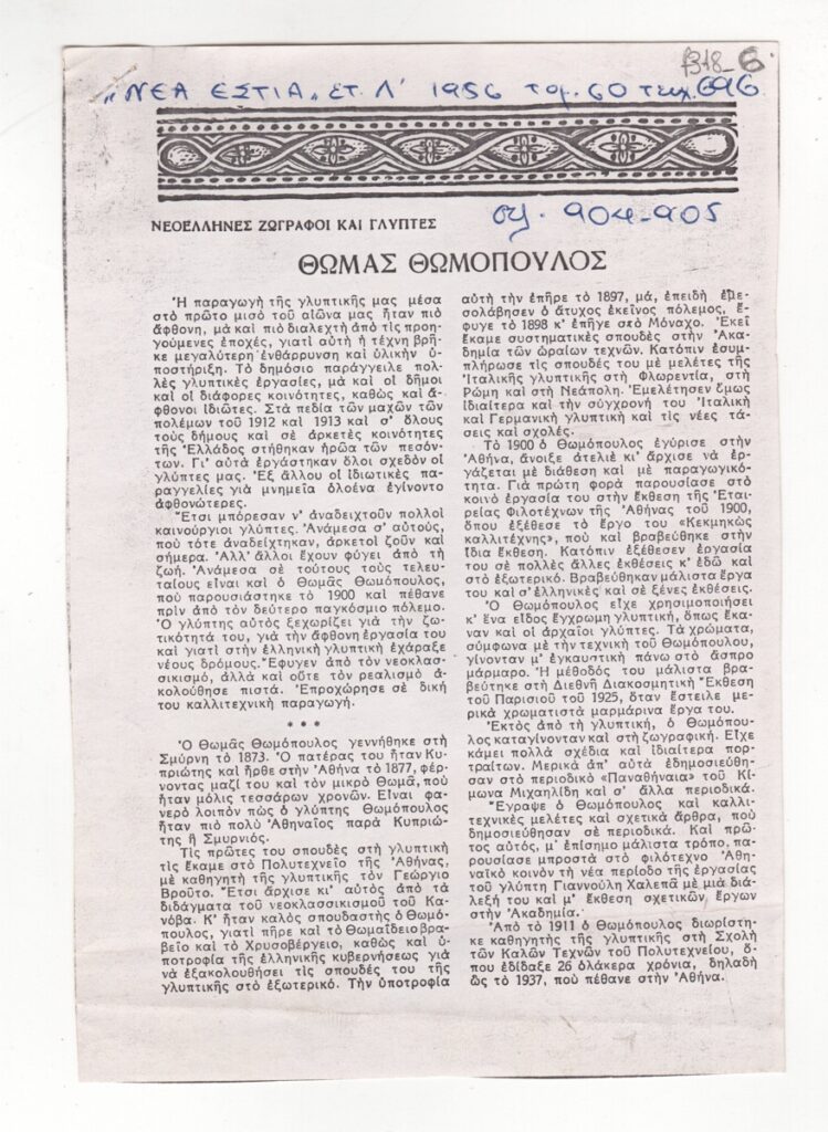 Φωτοαντίγραφο αποκομμάτων εντύπου, στα ελληνικά, χαρτί, 2 φφ, 16,7×11,5 εκ. Άρθρο του Φώτου Γιοφύλλη για τον γλύπτη και ζωγράφο Θωμά Θωμόπουλο. Εντάσσεται στη στήλη “Νεοέλληνες ζωγράφοι και γλύπτες. Δίνονται σύντομα βιογραφικά στοιχεία, στοιχεία για τα γλυπτικά του έργα και αξιολογείται το έργο του.