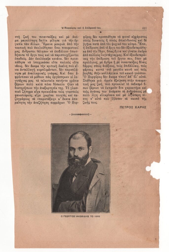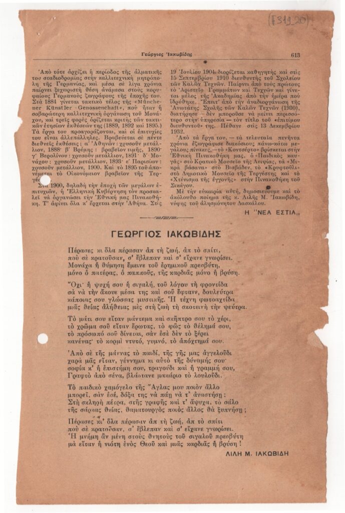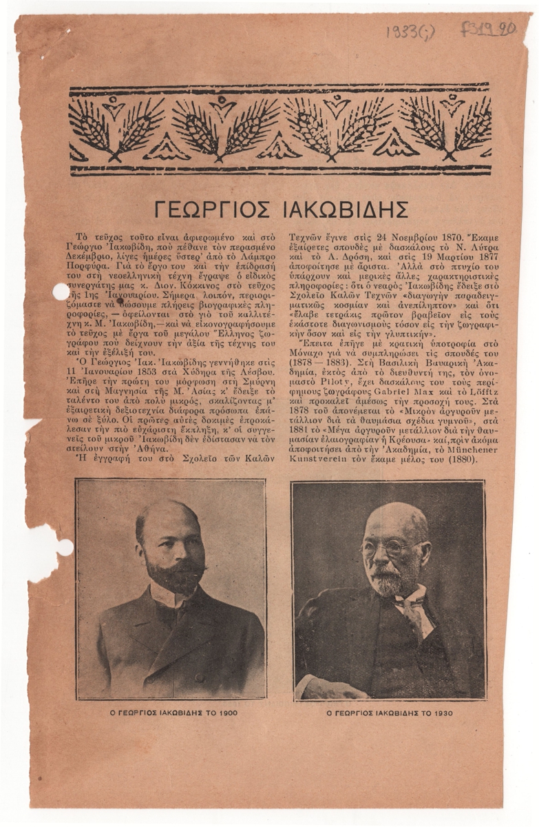 Αποκόμματα εντύπου, χαρτί, 2 φφ, 25,0×15,5 εκ., στα ελληνικά. Άρθρο για τον Γεώργιο Ιακωβίδη, το οποίο διατρέχει τα σημαντικότερα γεγονότα της δημιουργικής του πορείας. Δημοσιεύεται επίσης ποίημα της νύφης του καλλιτέχνη Λιλής Μ. Ιακωβίδη με τίτλο “Γεώργιος Ιακωβίδης”. Το άρθρο εικονογραφείται με αναπαραγωγή τριών φωτογραφιών του καλλιτέχνη. Στην πίσω όψη της πρώτης σελίδας δημοσιεύεται απόσπασμα άρθρου του Χάρη Πάτση με τίτλο “Ο Πορφύρας και η επίδρασή του”. Στην πίσω όψη του δεύτερου φύλλου δημοσιεύεται απόσπασμα της νουβέλας του Αλέξανδρου Κούπριν “Η Αλιόσια”.