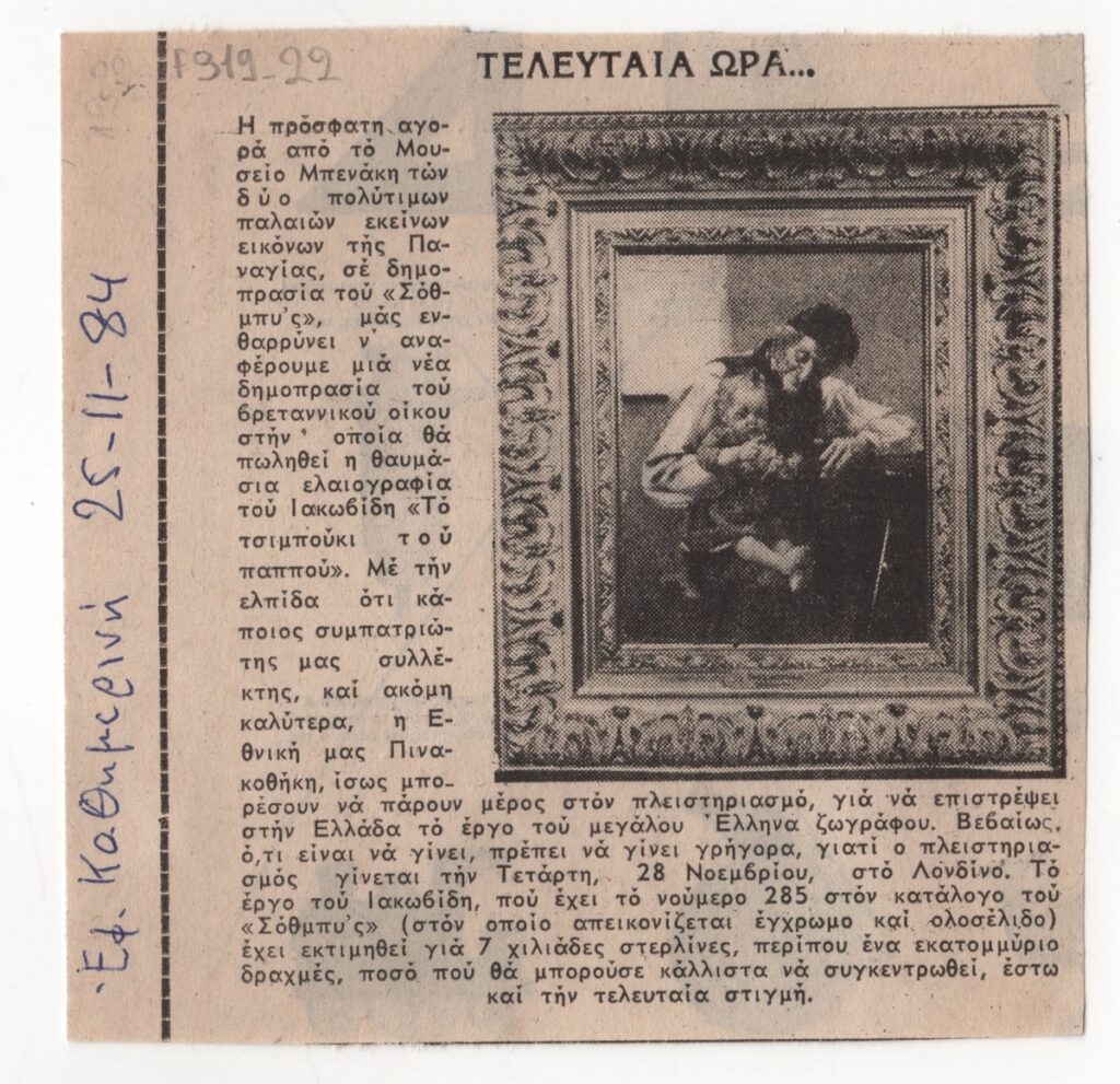 Απόκομμα, έντυπο, στα ελληνικά, χαρτί, 11,5×11,5 εκ., όπου δημοσιεύεται άρθρο σχετικά με τη δημοπράτηση από τον οίκο Sotheby’s της ελαιογραφίας του Γεώργιου Ιακωβίδη με τίτλο “Το τσιμπούκι του παππού”, με προτροπή για την αγορά του από Έλληνα συλλέκτη ή την Εθνική Πινακοθήκη. Το δημοσίευμα εικονογραφείται με αναπαραγωγή του έργου. Αριστερά επιγραφή με τα στοιχεία δημοσίευσης.