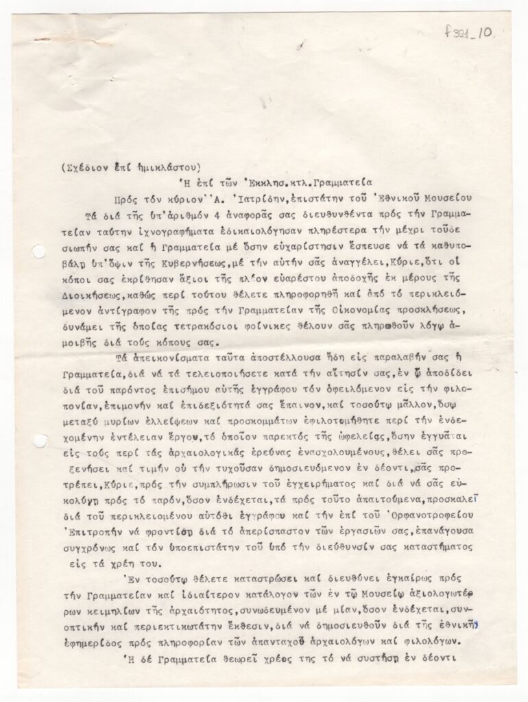 Μεταγραφή κειμένου, δακτυλόγραφη, στα ελληνικά, σε χαρτί, 28,8×21,2 εκ. Επιστολή του Ι. Ρίζου, γραμματέα της Γραμματείας των επί των Εκκλησιαστικών και της Δημοσίας Παιδείας προς τον Αθανάσιο Ιατρίδη, όπου επαινείται το έργο του και του αποδίδεται αμοιβή τετρακοσίων φοινίκων για αυτό. Επιπρόσθετα, του παραγγέλεται η δημιουργία καταλόγου προς δημοσίευση στην Εφημερίδα της Κυβερνήσεως.