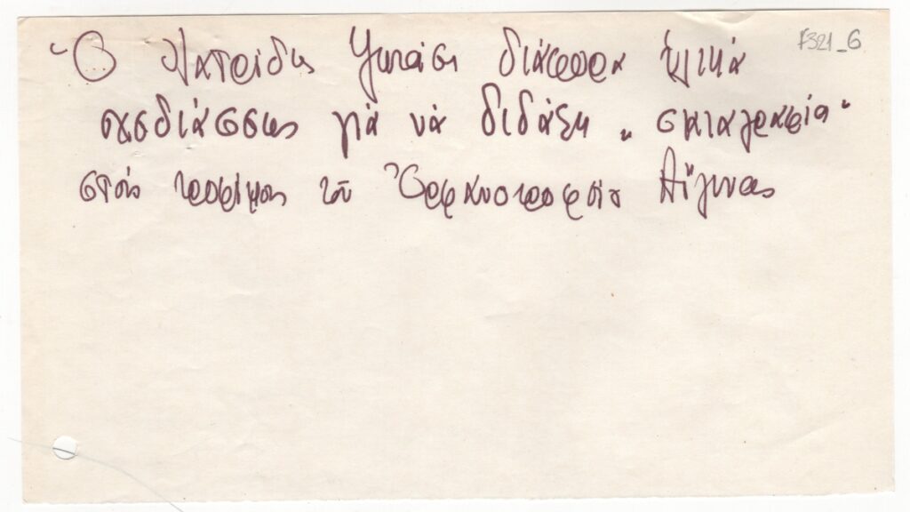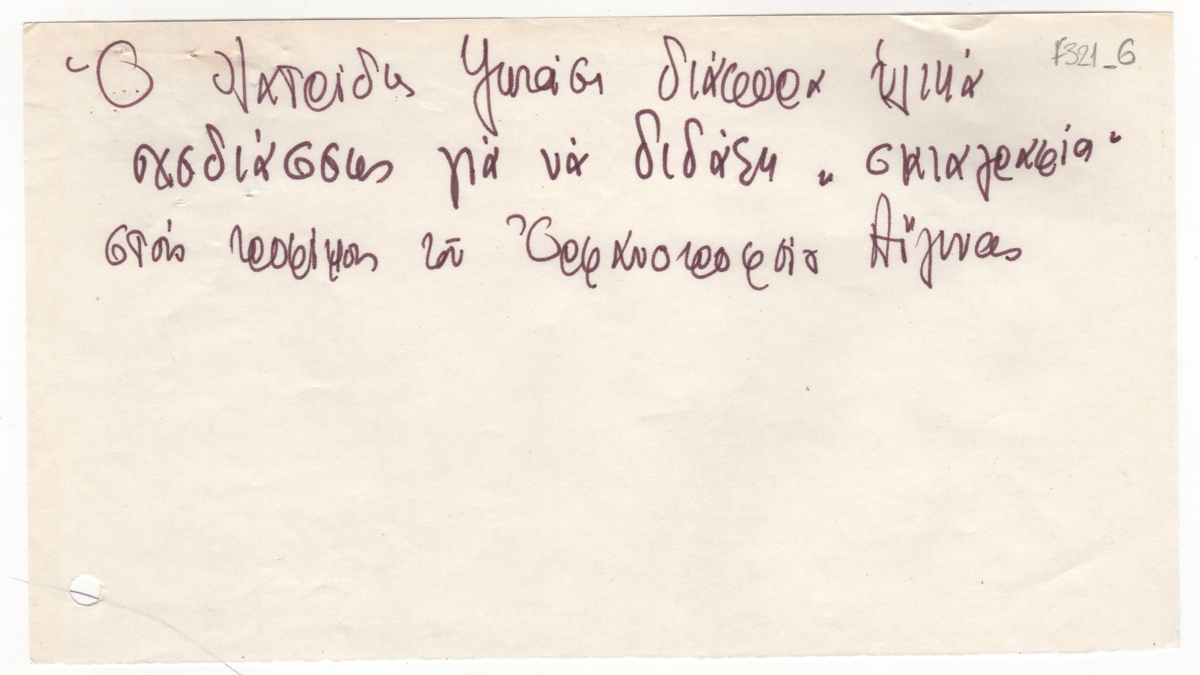 Σημείωμα, χειρόγραφο, σε απόκομμα χαρτιού, 12,0×21,2 εκ., στα ελληνικά. Σημείωση σχετικά με το περιεχόμενο της επιστολής του ζωγράφου Αθανάσιου Ιατρίδη προς τη Γραμματεία Εκκλησιαστικών και της Δομοσίου Εκπαιδεύσεως.