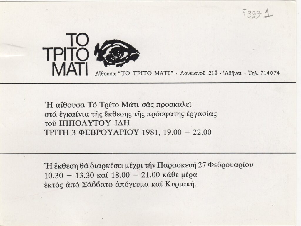 Πρόσκληση, χαρτόνι διπλής όψεως, 12,5×16,5 εκ., στα ελληνικά, ατομικής έκθεσης του Ιππόλυτου Ίδη.