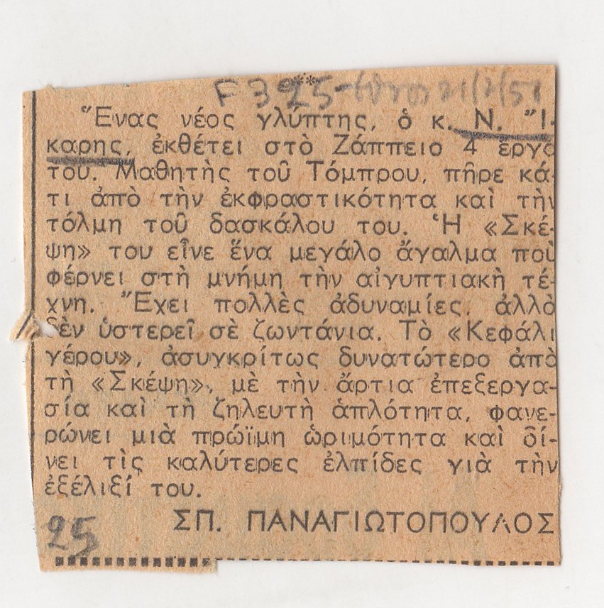 Απόκομμα, χαρτί, 4,5×5 εκ., στα ελληνικά, δημοσίευσης κριτικής έκθεσης του Νικόλαου Ίκαρη, η οποία διεξάγεται στο Ζάππειο Μέγαρο.