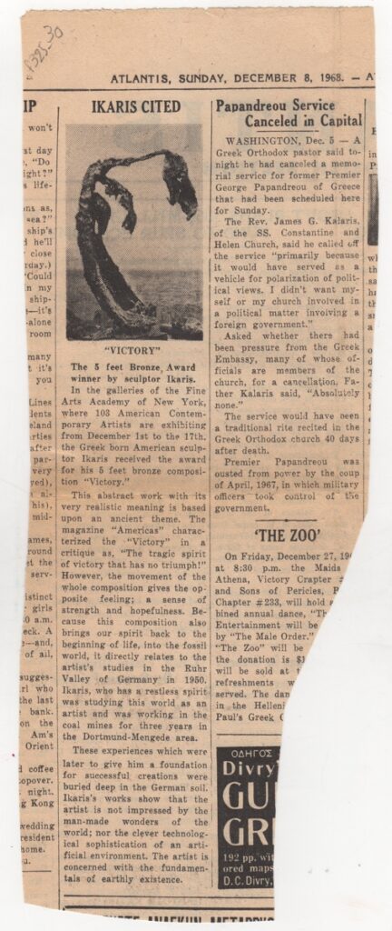 Απόκομμα, χαρτί, 28×11 εκ., στα αγγλικά, δημοσίευσης άρθρου το οποίο αναφέρεται στην απονομή βραβείου στον Νικόλαο Ίκαρη για το έργο του με τίτλο “Νίκη”, στα πλάισια ομαδικής έκθεσης γλυπτικής Σύγχρονων Αμερικανών Γλυπτών στην Νέα Υόρκη.