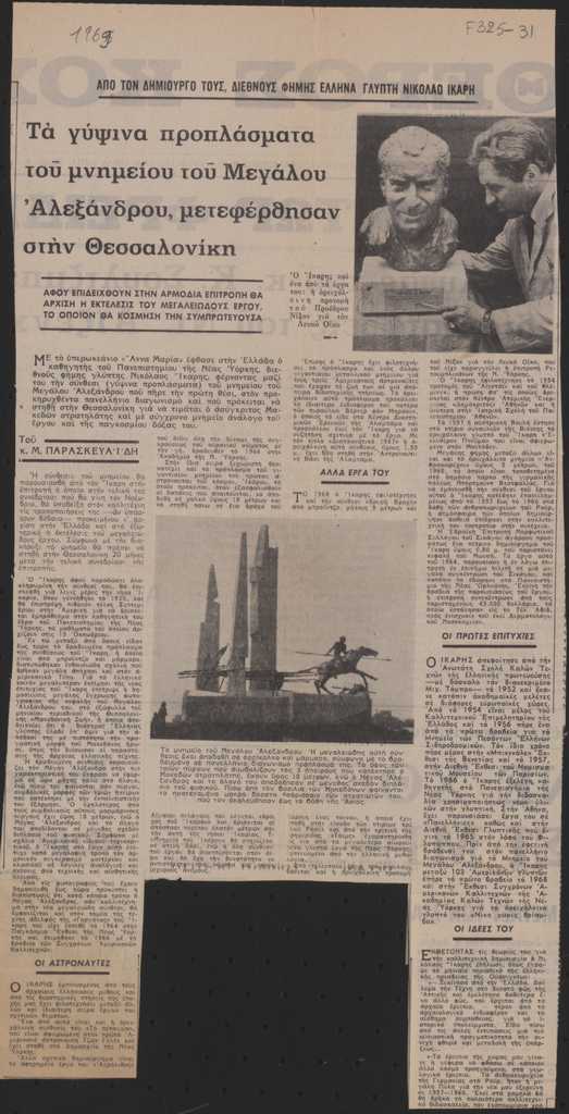 Απόκομμα, χαρτί ακανόνιστου μεγέθους, στα ελληνικά, δημοσίευσης άρθρου αναφερόμενου σε έργα του Νικόλαου Ίκαρη. Ειδικότερα, γίνεται ιδιαίτερη αναφορά στο μνημείο του Μέγα Αλέξανδρου του καλλιτέχνη και δίνονται πληροφορίες γι’ αυτόν, για το έργο του καθώς και αποσπάσματα κρίσεών του.