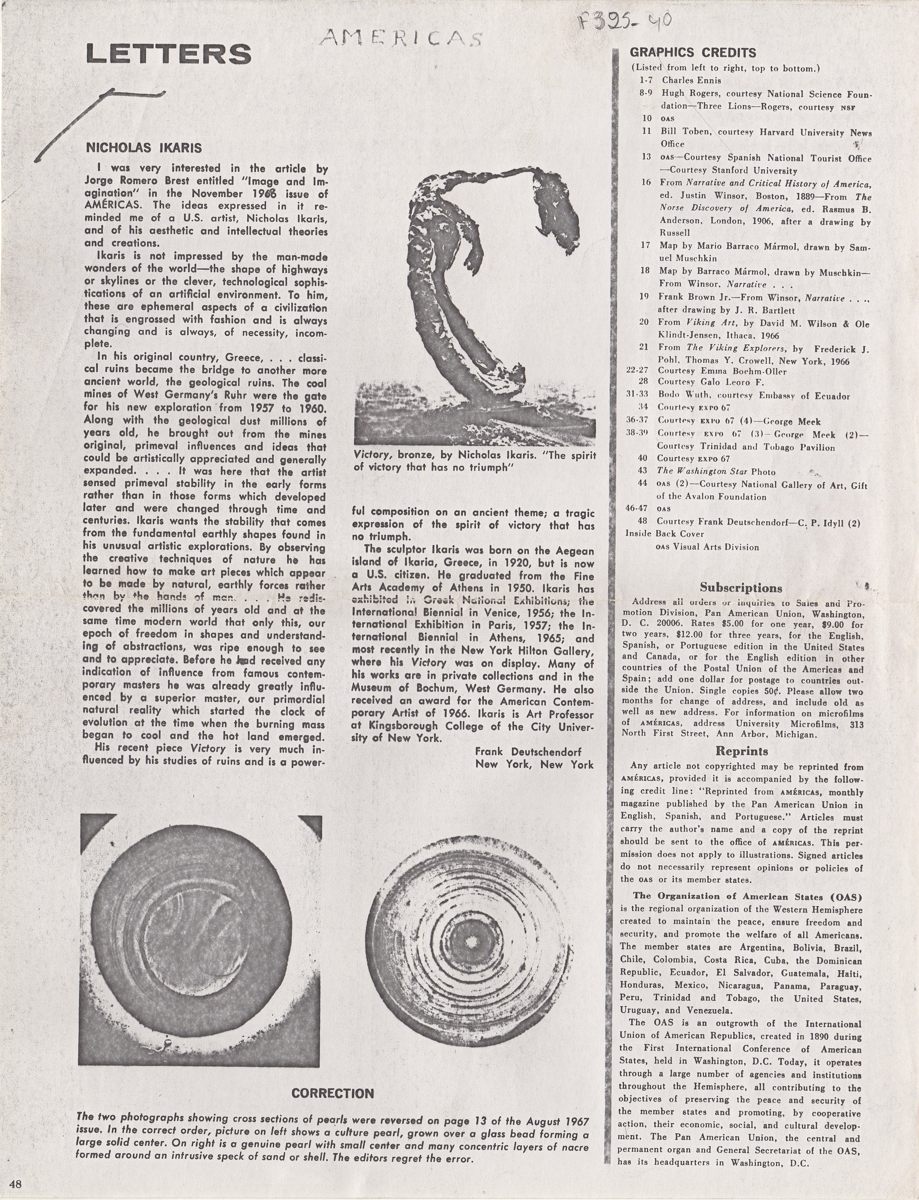 Φωτοαντίγραφο, χαρτί, 27×21 εκ., στα αγγλικά, δημοσίευσης κειμένου για τον Νικόλαο Ίκαρη και το έργο του. Το απόκομμα εικονογραφείται.