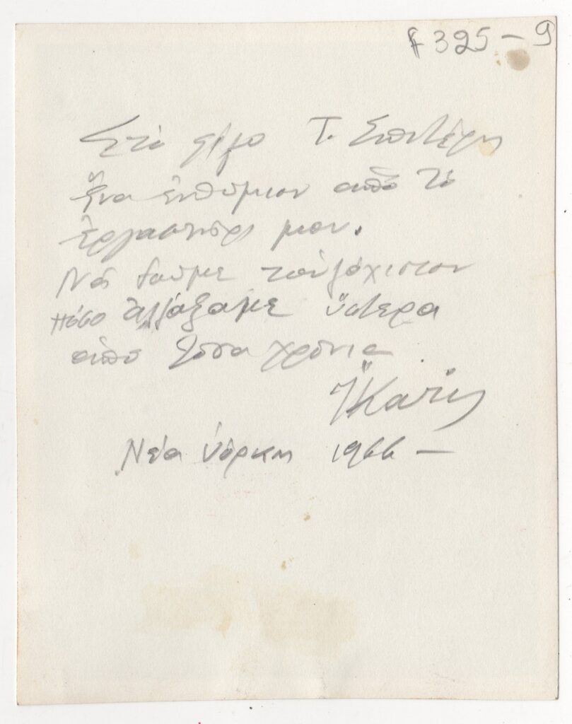 Φωτογραφία, α/μ, φωτογραφικό χαρτί, 12,5×10 εκ. του Νικόλαου Ίκαρη με έργο του, απεσταλμένη προς τον Τώνη Σπητέρη.
