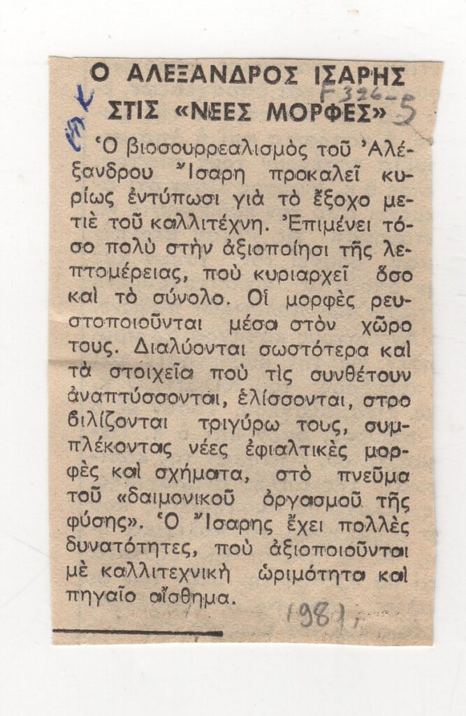 Απόκομμα, χαρτί, 7,5×5 εκ., στα ελληνικά, δημοσίευσης κριτικής έκθεσης τουΑλέξανδρου Ίσαρη, η οποία διεξάγεται στην γκαλερί Νέες Μορφές, στην Αθήνα.