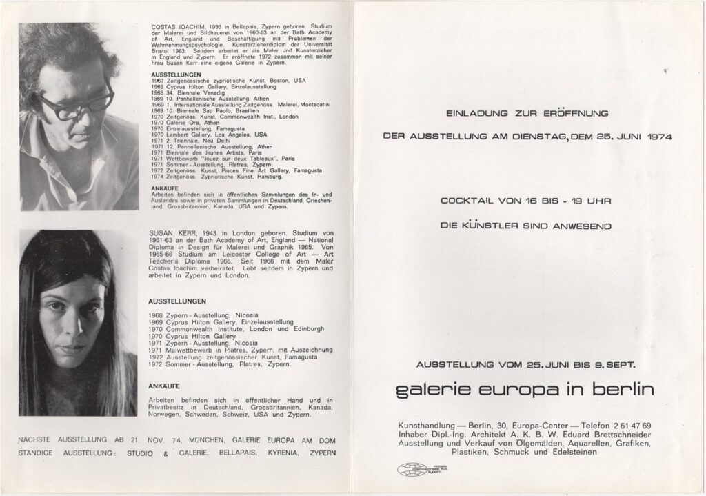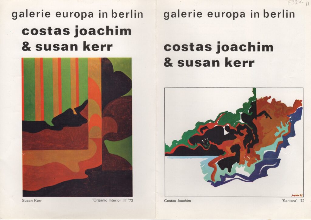 Έντυπο, χαρτί ιλλουστρασιόν αναδιπλωμένο, 21×15 εκ., στα γερμανικά, ομαδικής έκθεσης των Κώστα Ιωακείμ και Susan Kerr. Περιέχει βιογραφικά των καλλιτεχνών και εικονογράφηση.