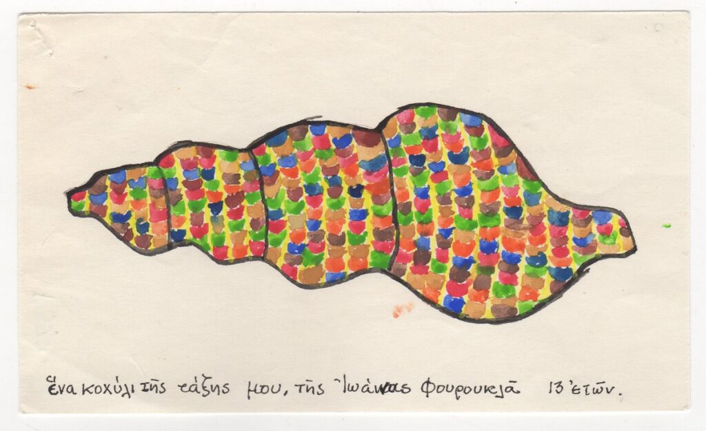 Απόκομμα χαρτιού, 8×13,5 εκ., με αναπαραγωγή έργου της Ιωάννας Φουρουκλά, μαθήτριας του Κώστα Ιωακείμ.