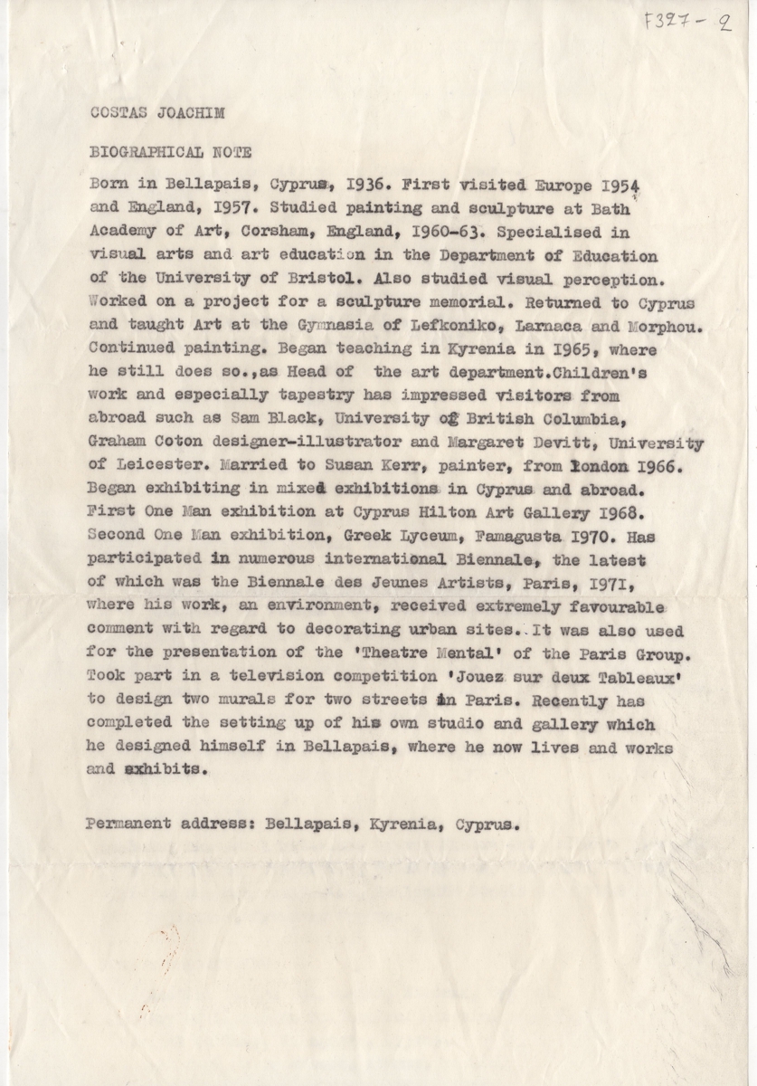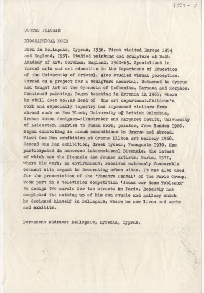 Βιογραφικό, δακτυλόγραφο, χαρτί, 31×20 εκ., στα αγγλικά του Κώστα Ιωακείμ.