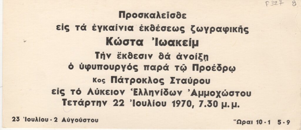 Πρόσκληση, χαρτόνι, 10×22,5 εκ., στα ελληνικά, ατομικής έκθεσης ζωγραφικής του Κώστα Ιωακείμ, η οποία διεξάγεται στο Λύκειο Ελληνίδων Αμμοχώστου.
