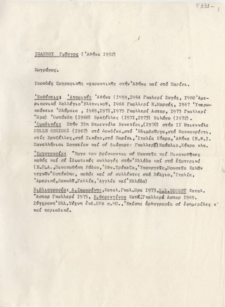 Βιογραφικό, δακτυλόγραφο, χαρτί, 28,5×21 εκ., στα ελληνικά, του Γιώργου Ιωάννου. Περιέχει εκθέσεις, εργογραφία και βιβλιογραφία.
