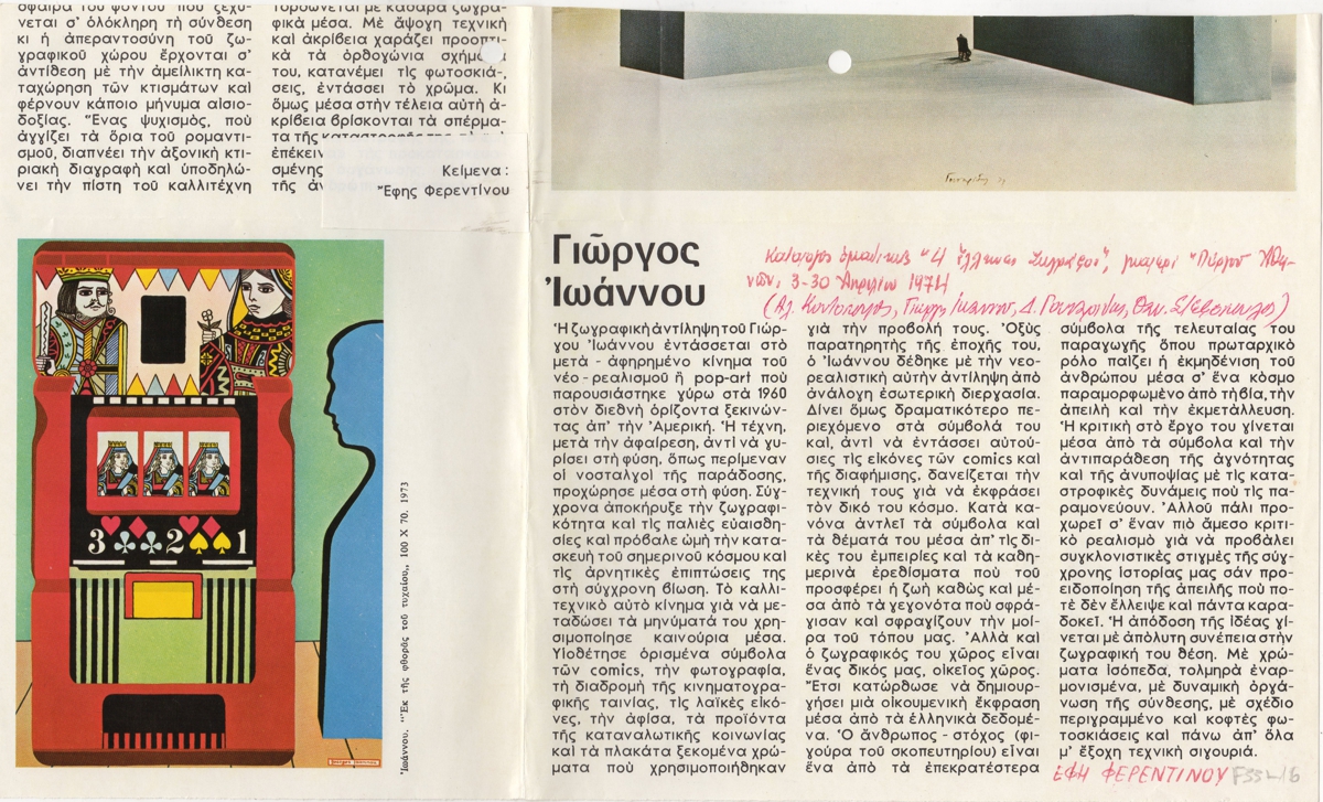 Απόκομμα, χαρτί ιλλουστρασιόν, 18,5×30,5 εκ., στα ελληνικά, ομαδικής έκθεσης των Γ. Ιωάννου, Αλ. Κοντόπουλου, Δ. Γουναρίδη, Θ. Στεφόπουλου. Το απόκομμα περιέχει κείμενο της Έφης Φερεντίνου για το έργο του Γιώργου Ιωάννου, εικονογραφείται και φέρει επιγραφές.