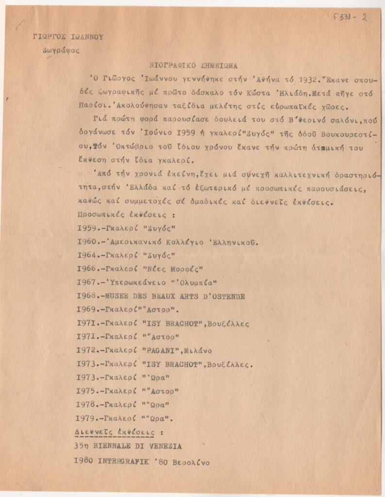 Βιογραφικό, δακτυλόγραφο, χαρτί, 3 φφ, 27×21 εκ., στα ελληνικά, του Γιώργου Ιωάννου. Περιέχει προσωπικές πληροφορίες, λίστα εκθέσεων και αναφορές για το έργο του.