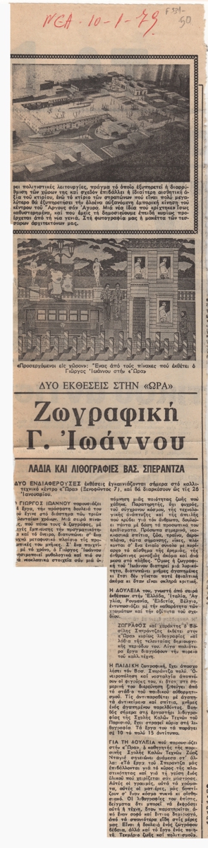 Απόκομμα, χαρτί, 43,5×10 εκ., στα ελληνικά, δημοσίευσης άρθρου που αναφέρεται στην έναρξη ατομικών εκθέσεων των Γιώργου Ιωάννου και Βασίλη Σπεράντζα στο Καλλιτεχνικό Πνευματικό Κέντρο Ώρα το 1979.