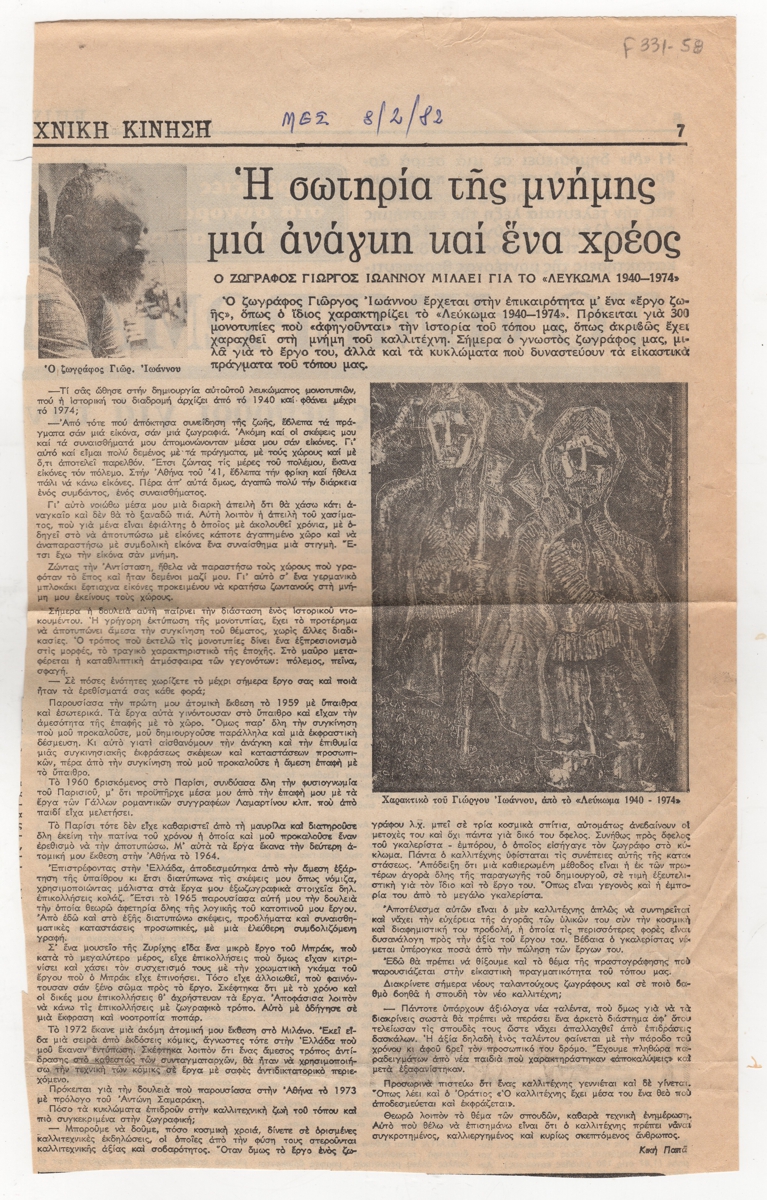Απόκομμα, χαρτί, 34,5×21,5 εκ., στα ελληνικά, δημοσίευσης συνέντευξης του Γιώργου Ιωάννου, στην οποία ο καλλιτέχνης μιλά για το Λεύκωμά του.