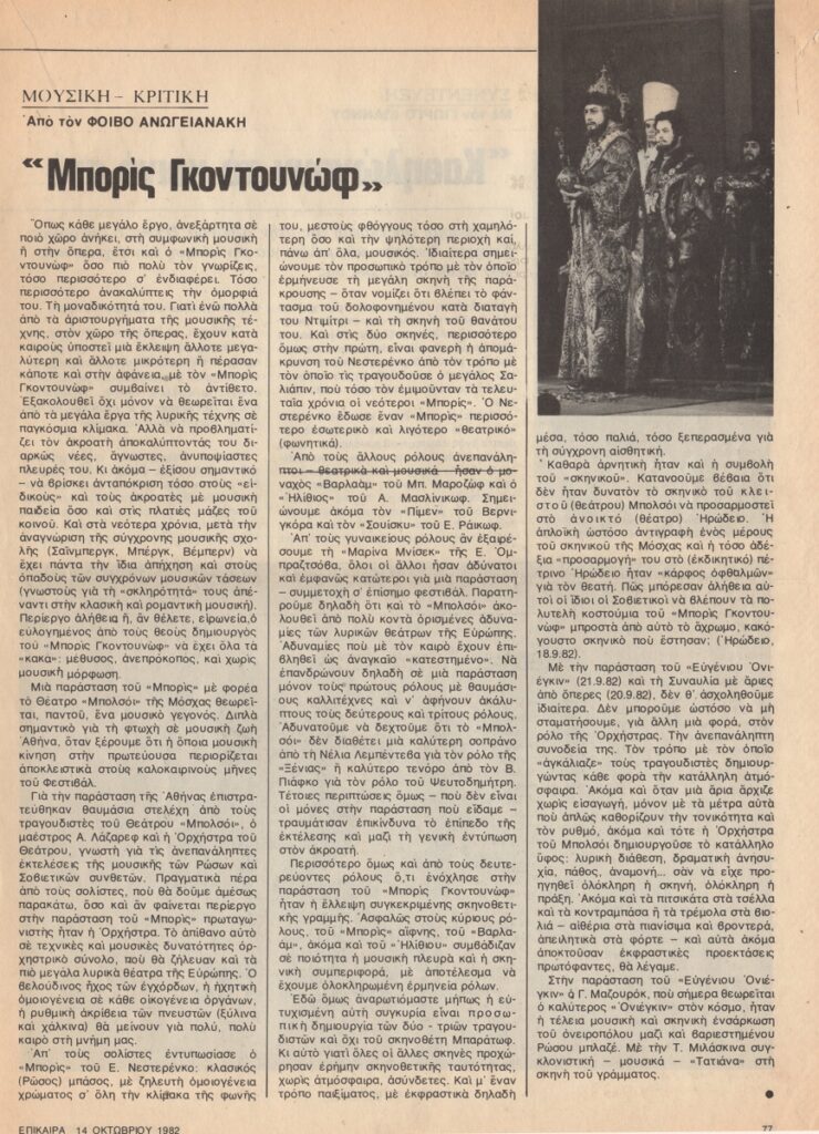 Απόκομμα, χαρτί, 29×21 εκ., στα ελληνικά, δημοσίευσης κριτικής για την όπερα Μπορίς Γκοντουνώφ.