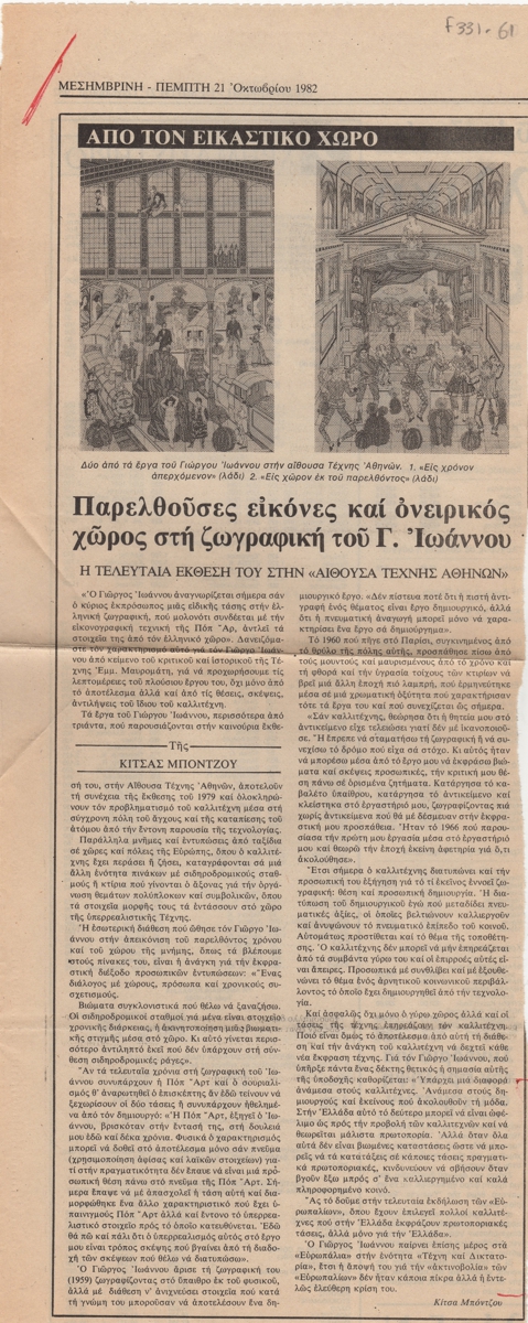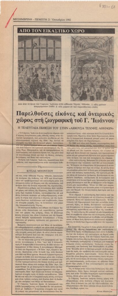 Απόκομμα, χαρτί, 40.5×16 εκ., στα ελληνικά, δημοσίευσης κριτικής έκθεσης του Γιώργου Ιωάννου, η οποία διεξάγεται στην Αίθουσα Τέχνης Αθηνών.