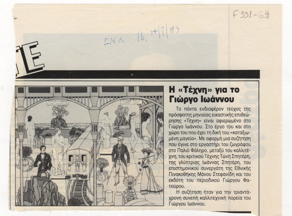 Απόκομμα, χαρτί, 12,5×16 εκ., στα ελληνικά, δημοσίευσης άρθρου που αναφέρεται στο αφιέρωμα του εικαστικού περιοδικού “Τέχνη” στον Γιώργο Ιωάννου, που πραγματοποιήθηκε μετά από συζήτηση των Τώνη και Ιωάννας Σπητέρη, Μάνου Στεφανίδη και Γιώργου Φατούρου, για την 30ετή πορεία του καλλιτέχνη.