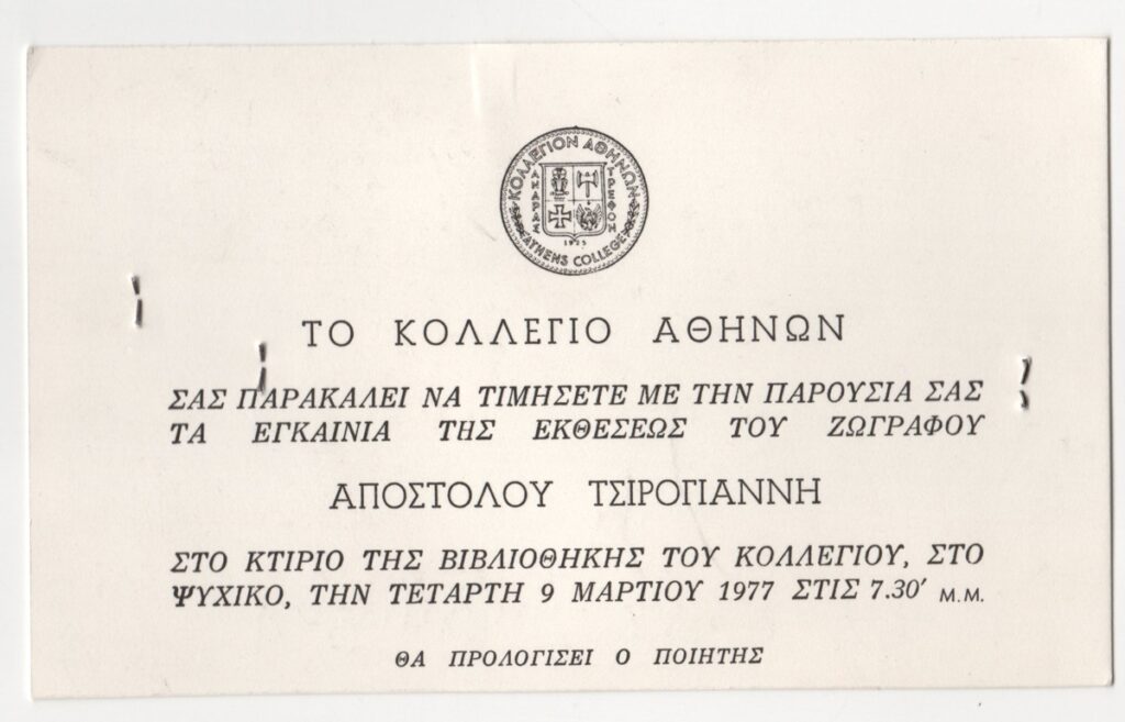 Απόκομμα εντύπου έκθεσης, στα ελληνικά, μονόφυλλο, χαρτόνι, 8,6×14,0 εκ. Αφορά τα εγκαίνια της έκθεσης ζωγραφικής του Απόστολου Τσιρογιάννη στην Αθήνα τον Μάρτιο του 1977. Στην πίσω όψη βρέθηκε συρραμένο απόκομμα εντύπου με δημοσίευμα για ατομική έκθεση του Σταύρου Ιωάννου.