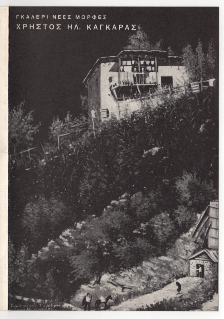 Έντυπο, στα ελληνικά, δίφυλλο, χαρτί, 17,2×12,0 εκ. Έντυπο ατομικής έκθεσης του Χρήστου Καγκαρά στην Αθήνα το 1970. Περιέχει κατάλογο έργων και κείμενα για τον καλλιτέχνη του τεχνοκρίτη Κριστιάν Ζερβού (Παρίσι 11/1967, με βιογραφικά στοιχεία για τον καλλιτέχνη), του ζωγράφου Yves Alix (Παρίσι 12/1967) και του τεχνοκρίτη Jacques Dupin (Παρίσι 01/1968). Εξωτερικά εικονογραφείται με αναπαραγωγή έργου του καλλιτέχνη.