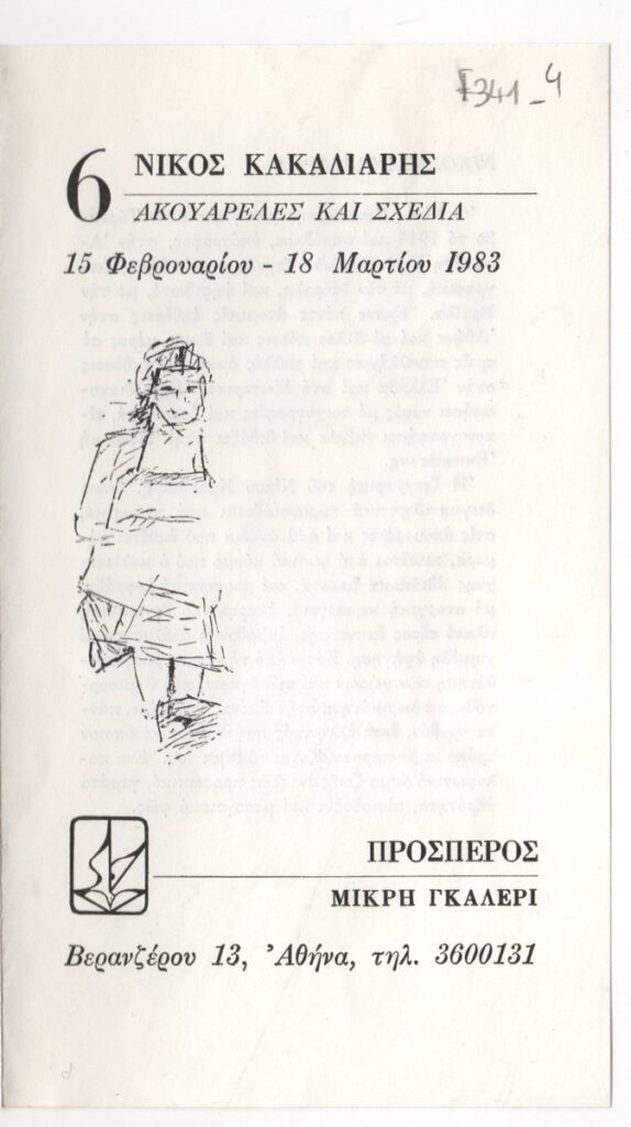 Έντυπο, στα ελληνικά, δίπτυχο, χαρτί, 16,2×9,5 εκ. Έντυπο της ατομικής έκθεσης με ακουαρέλες και σχέδια του Νίκου Κακαδιάρη στην Αθήνα το 1983. Περιέχει βιογραφικό καλλιτέχνη και παρουσίαση του έργου του, καθώς και κατάλογο έργων έκθεσης. Στο εξώφυλλο εικονογραφείται με αναπαραγωγή έργου.