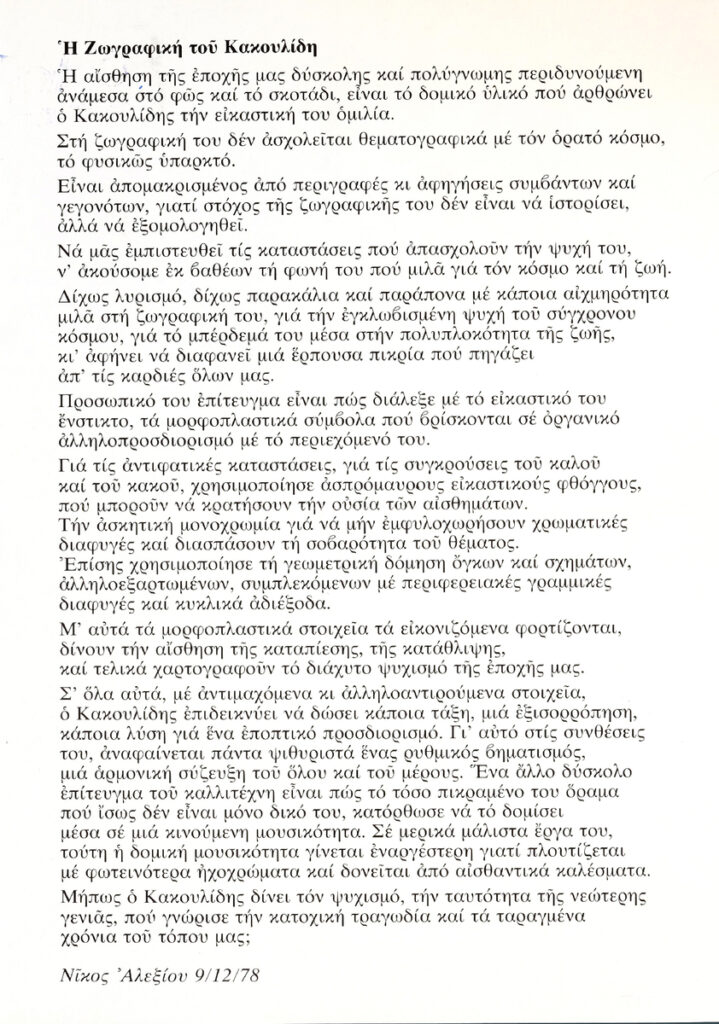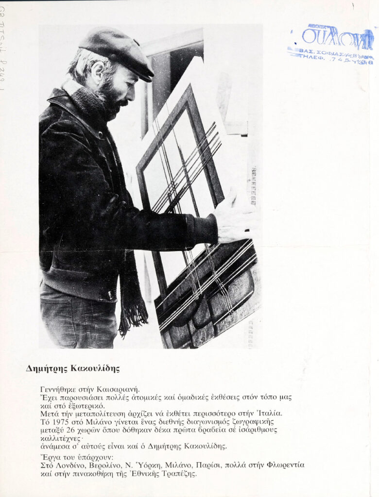 Αφίσα της έκθεσης του Δημήτρη Κακουλίδη στην Αίθουσα Τέχνης “Συλλογή” στην Αθήνα. Στην οπίσθια όψη βιογραφικό και φωτογραφία του καλλιτέχνη και κριτική του Νίκου Αλεξίου.