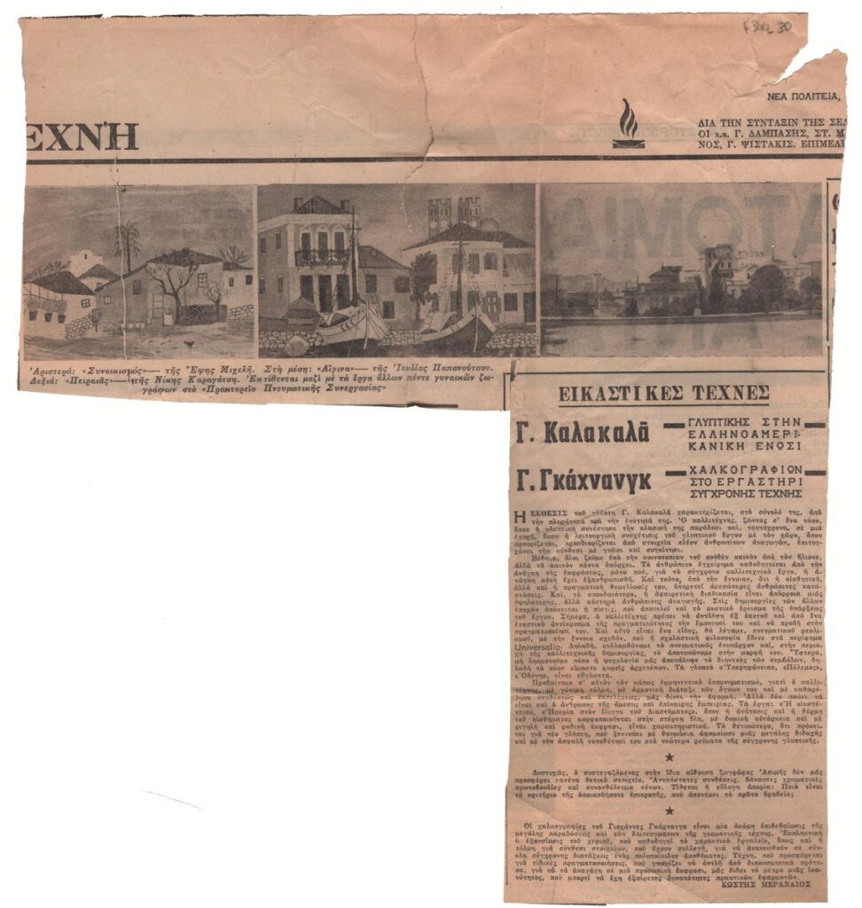 Απόκομμα, έντυπο, χαρτί, 27,7×25,3 εκ., όπου δημοσιεύεται, στα ελληνικά, κριτική του Κωστή Μεραναίου για τις παράλληλες εκθέσεις γλυπτικής του Γ. Καλακαλά, ζωγραφικής του Χριστόφορου Ασιμή και χαλκογραφιών του Johannes Gachnang στην Αθήνα το φθινόπωρο του 1968. Εικονογραφείται με αναπαραγωγές έργων της Αθηνάς Μιχελή, της Νίκης Καραγάτση και της Ιουλίας Παπανούτσου από παράλληλη ομαδική έκθεση οκτώ γυναικών καλλιτεχνών στην Αθήνα την ίδια περίοδο.
