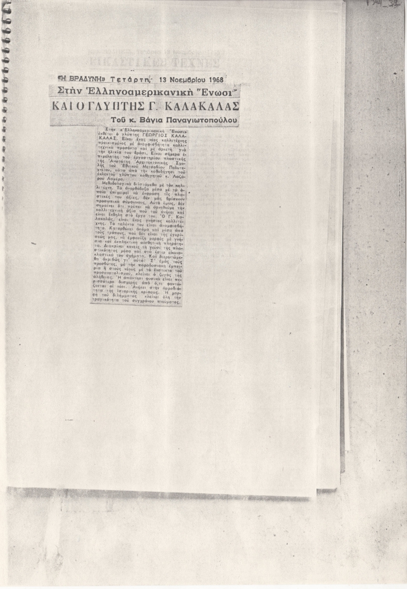 Φωτοαντίγραφο αποκόμματος εφημερίδας, στα ελληνικά, χαρτί, 29,8×21,0 εκ. Κριτική του Βάγια Παναγιωτόπουλου για την έκθεση γλυπτικής του Γιώργου Καλακαλά στην Αθήνα το 1968.