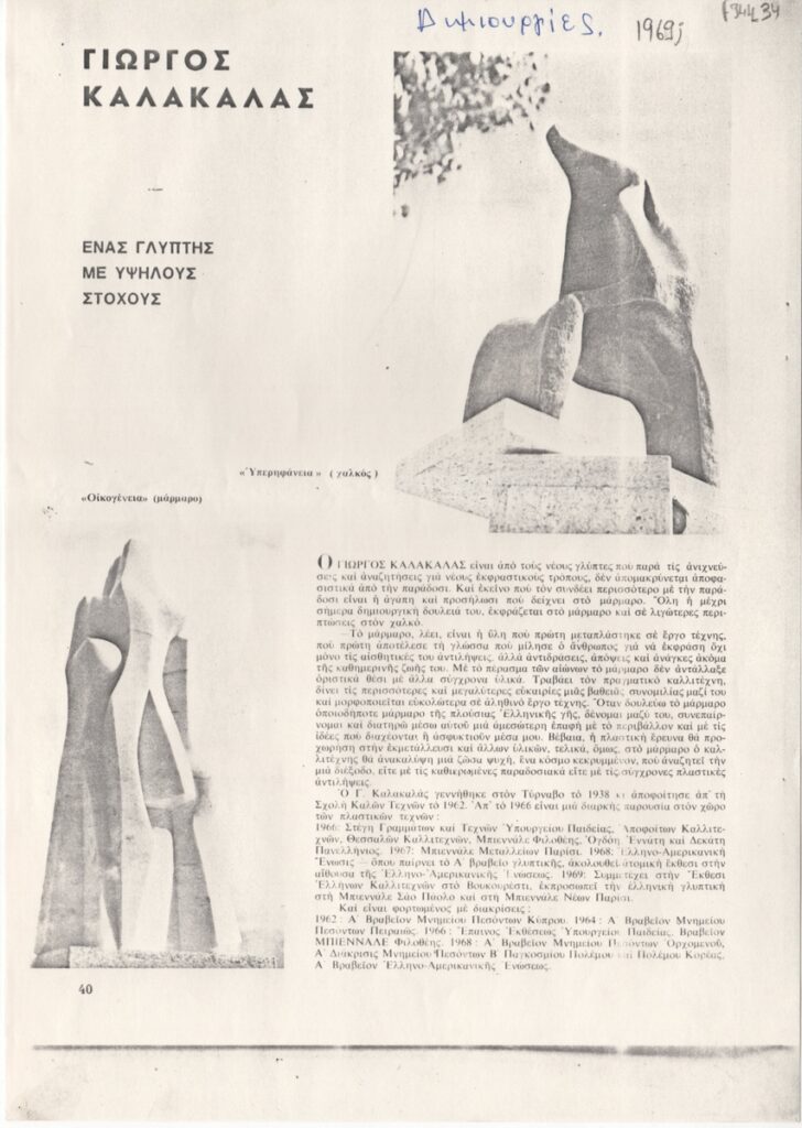 Φωτοαντίγραφο αποκόμματος εντύπου, στα ελληνικά, χαρτί, 29,8×21,0 εκ. Κείμενο για τον καλλιτέχνη με παρουσίαση του έργου του και σύντομο βιογραφικό Εικονογραφείται με αναπαραγωγές έργων. Επάνω επιγραφή.