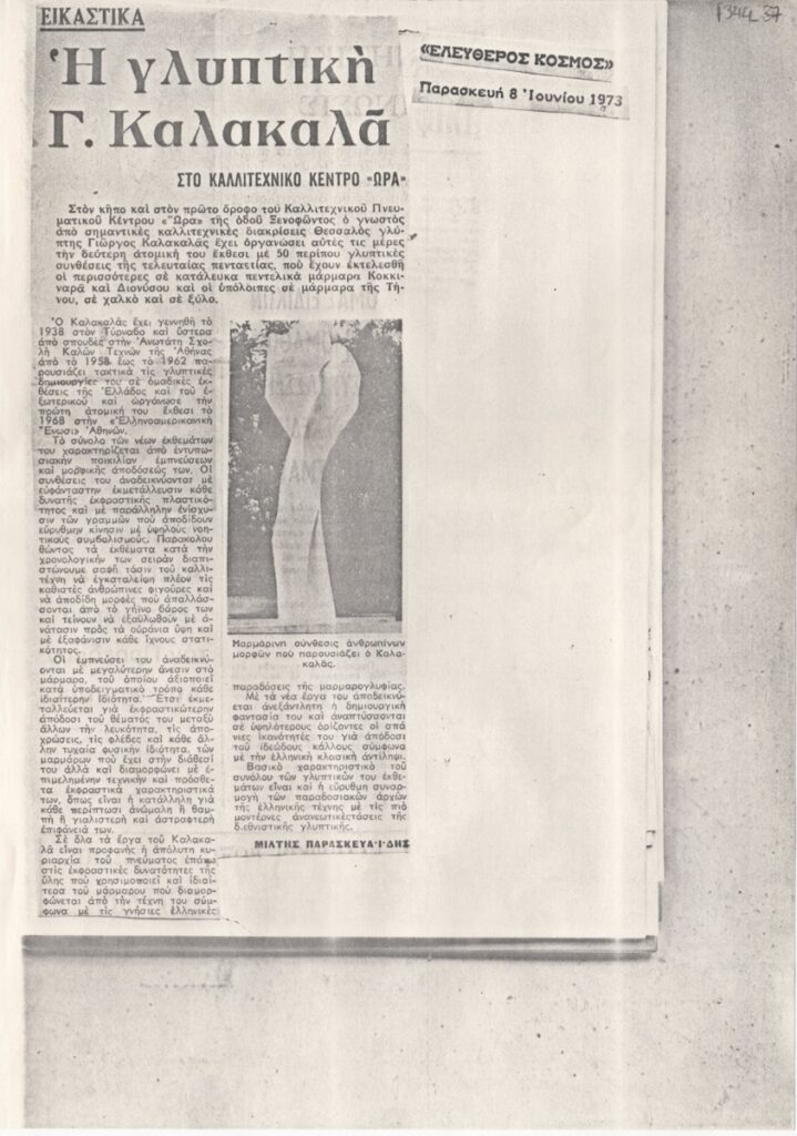 Φωτοαντίγραφο αποκόμματος εφημερίδας, στα ελληνικά, χαρτί, 29,8×21,0 εκ. Κριτική του Μίλτη Παρασκευαΐδη για την ατομική έκθεση του Γιώργου Καλακαλά στην Αθήνα το 1973. Εικονογραφείται με αναπαραγωγή έργου.