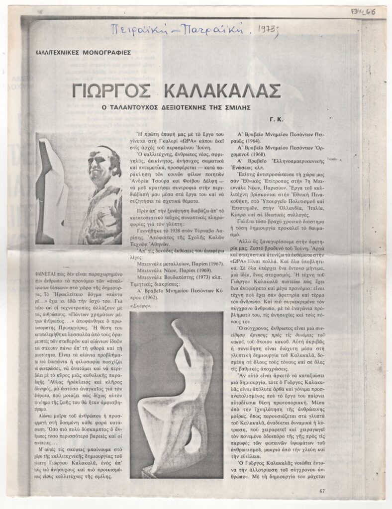 Φωτοαντίγραφο αποκόμματος εφημερίδας, στα ελληνικά, χαρτί, 33,5×25,5 εκ. Άρθρο για το έργο του γλύπτη Γιώργου Καλακαλά με αφορμή την έκθεσή του στην Αθήνα το 1973. Εικονογραφείται με φωτογραφία του καλλιτέχνη και αναπαραγωγές έργων.