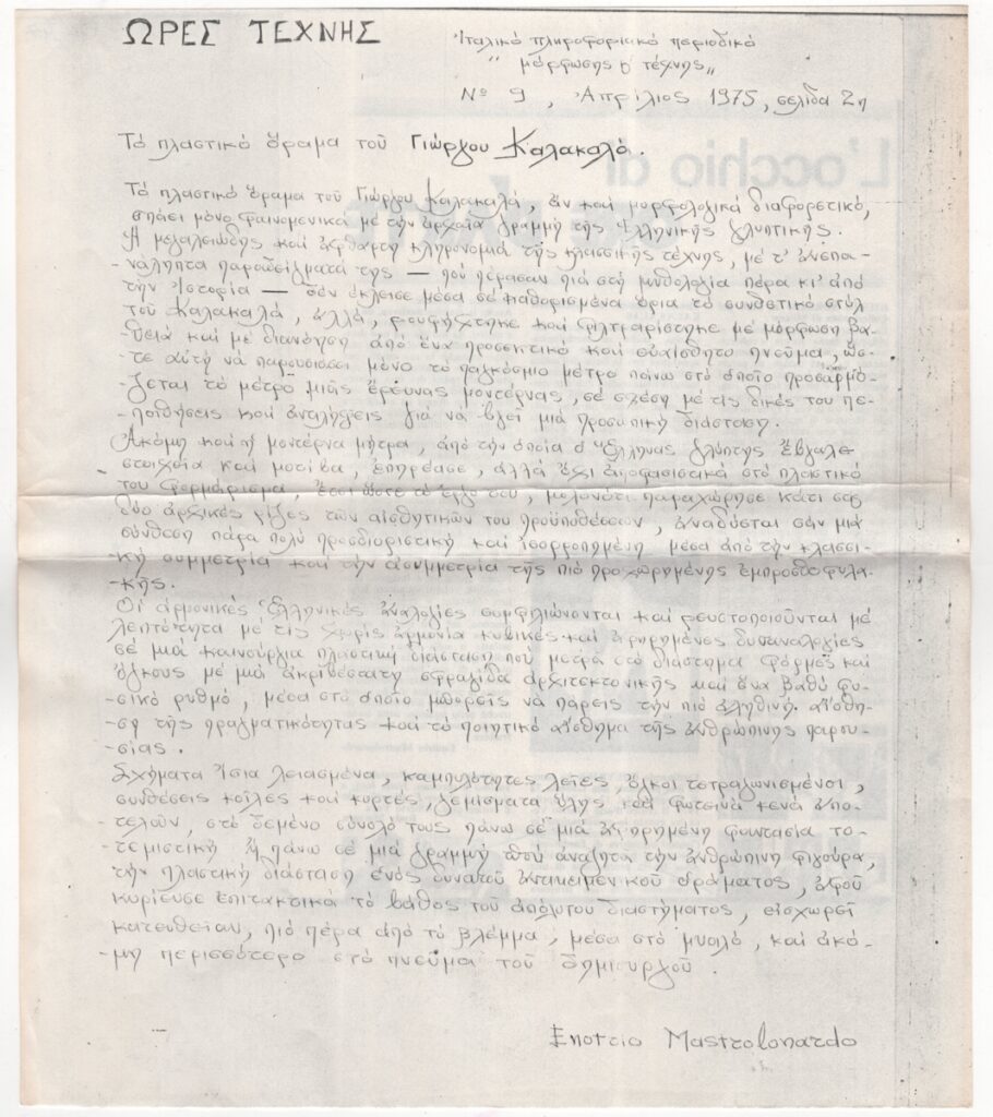 Φωτοαντίγραφο αποκόμματος εφημερίδας, στα ιταλικά, χαρτί, 29,8×25,5 εκ. Κριτική της ατομικής έκθεσης του Giulio Soriani από τον Mario με τίτλο “Giulio Soriani al Cub del Collezionista di Milano”, της ατομικής έκθεσης του Γιώργου Καλακαλλά από τον Enotrio Mastrolonardo με τίτλο “Visione plastica di Giorgio Kalakalas” και του Ferdinando Chevrier από τον Ridy Margara με τίτλο “Ferdinando Chervrier ha tenuto una personale allla Galleria 72 di Bergamo”. Τα άρθρα εικονογραφούνται με αναπαραγωγές φωτογραφιών από τα εγκαίνια των εκδηλώσεων και έργου του Γιώργου Καλακαλά.