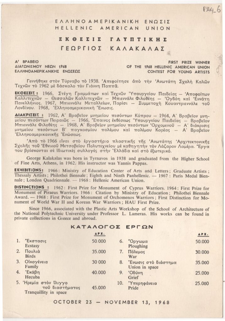 Έντυπο έκθεσης, στα ελληνικά και αγγλικά, χαρτόνι, 24,6×17,0 εκ. Αφορά στην ατομική έκθεσης γλυπτικής του Γιώργου Καλακαλλά στην Αθήνα το φθινόπωρο του 1968. Περιλαμβάνει σύντομο βιογραφικό καλλιτέχνη, εκθέσεις, διακρίσεις και κατάλογος έργων της έκθεσης.