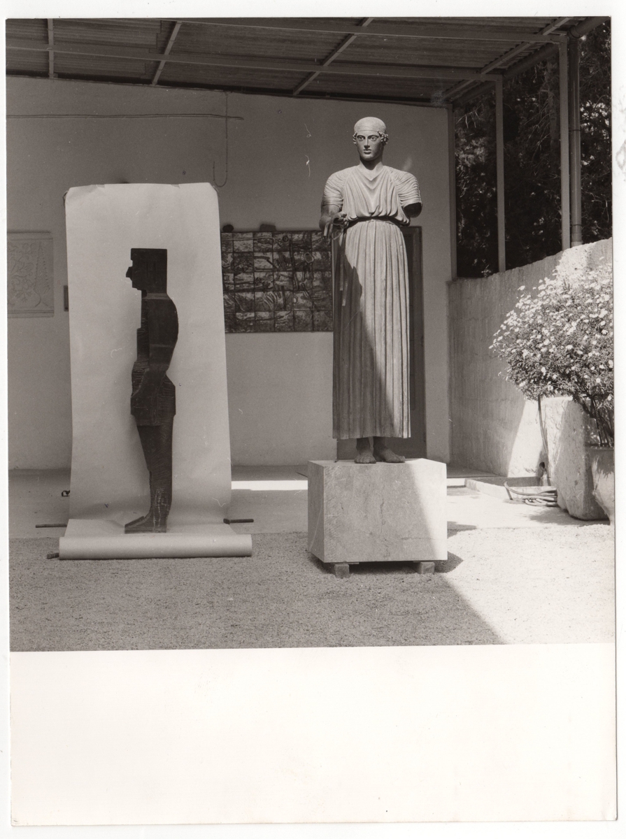 Φωτογραφία έργου, α/μ, σε φωτογραφικό χαρτί, 17,2×13,0 εκ. Αναπαραγωγή έργου του Δημήτρη Καλαμάρα δίπλα στον Ηνίοχο στο Αρχαιολογικό Μουσείο των Δελφών.