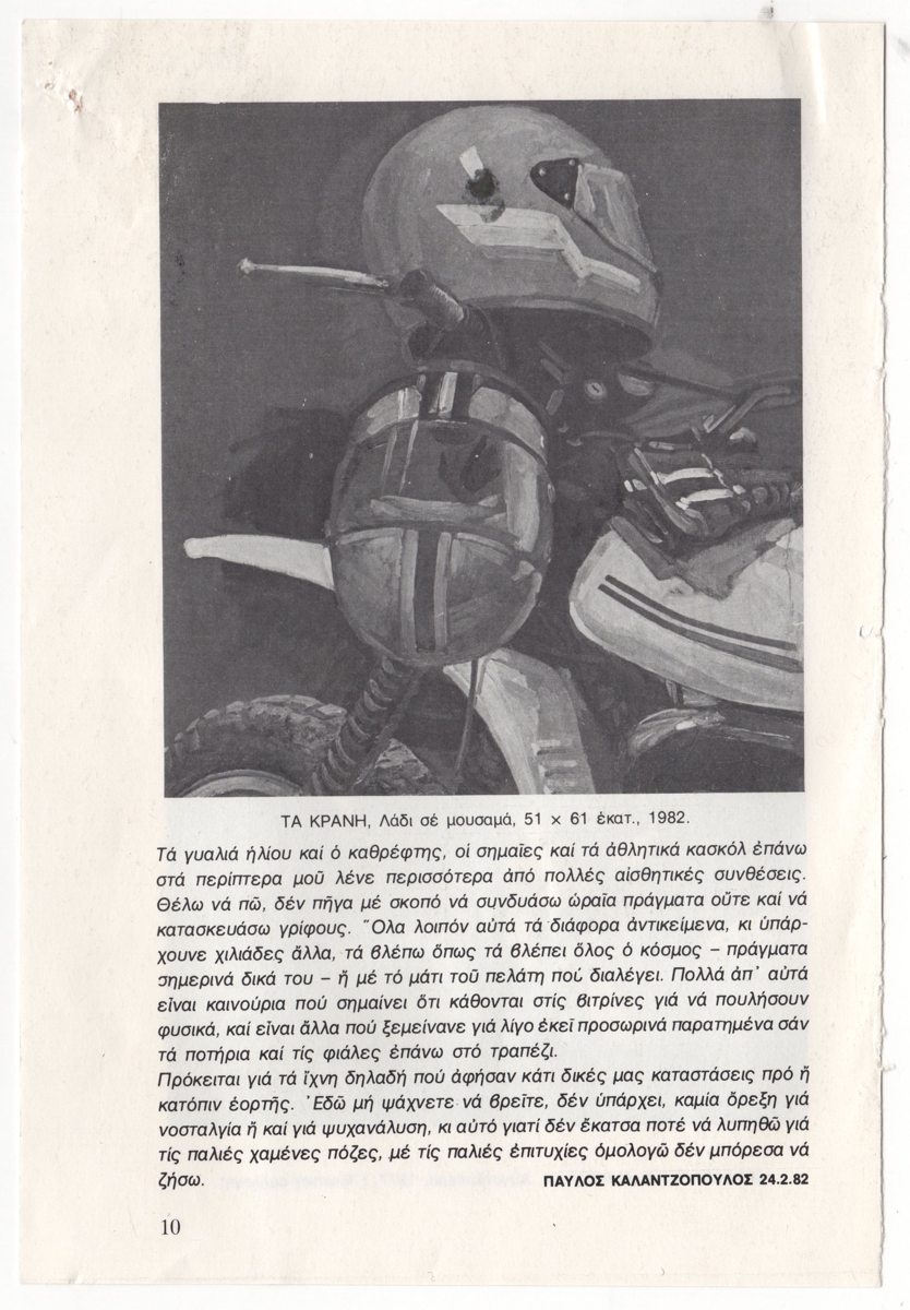 Απόκομμα εντύπου, στα ελληνικά, χαρτί ιλουστρασιόν, 21,0×14,3 εκ. Απόκομμα εντύπου για την ομαδική έκθεση ζωγραφικής με τίτλο “Αντικείμενα” όπου συμμετείχαν οι Παύλος Καλαντζόπουλος, Λευτέρης Κανακάκις, Σαράντης Καραβούζης, Γιώργος Μανουσάκης και Χρόνης Μπότσογλου στην Αθήνα το 1982. Περιέχει κείμενο του καλλιτέχνη, γραμμένο στις 24/02/1982 και σύντομο βιογραφικό καλλιτέχνη. Εικονογραφείται με φωτογραφία του καλλιτέχνη και αναπαραγωγές έργων.