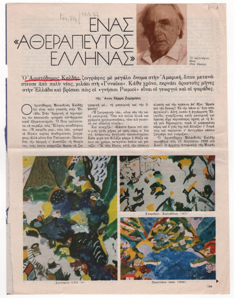 Απόκομμα, έντυπο, στα ελληνικά, ιλουστρασιόν χαρτί, 29,8×23,0 εκ. Συνέντευξη του ζωγράφου Αριστόδημου Καλδή στην Άννυ Χέρρα Ζυμαράκη για τις επιρροές και το έργο του.