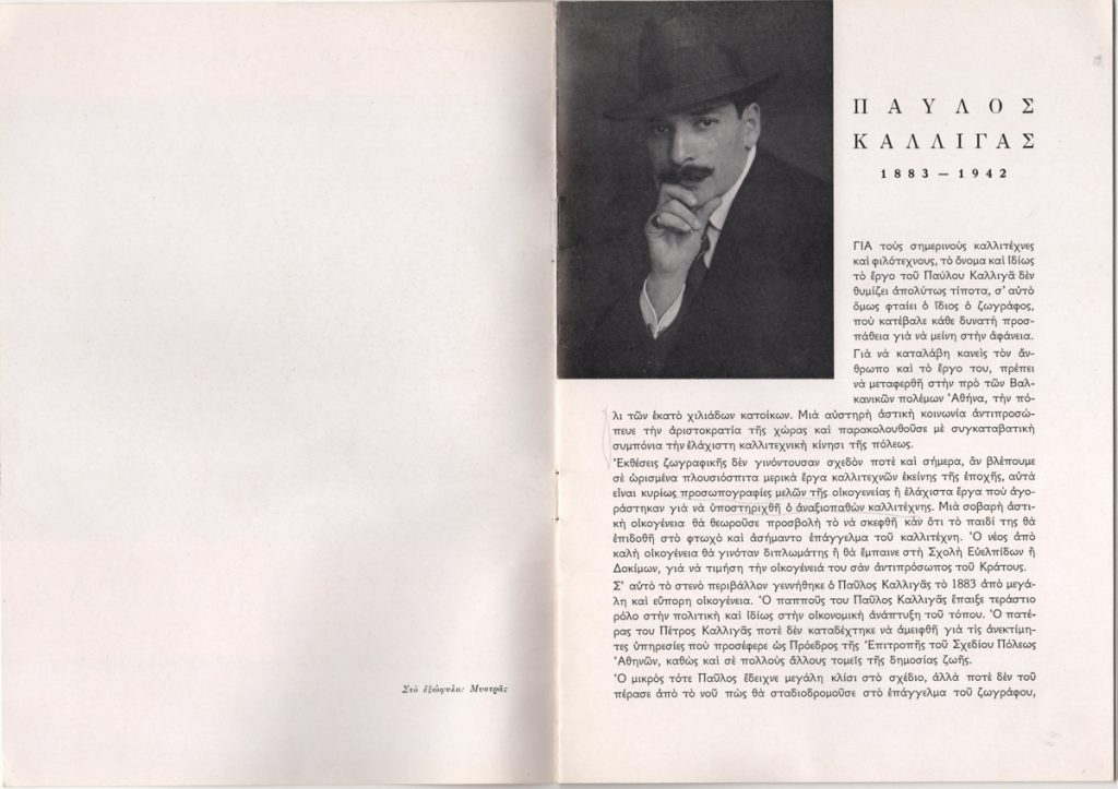 Έντυπο, στα ελληνικά, ιλουστρασιόν χαρτί, 6 φφ., 23,5×16,7 εκ. Έντυπο της έκθεσης ζωγραφικής του Παύλου Καλλιγά στην Αθήνα το 1961. Περιέχει κείμενο του Περικλή Βυζάντιου για τον καλλιτέχνη και κατάλογο έργων της έκθεσης. Εικονογραφείται με αναπαραγωγές έργων.