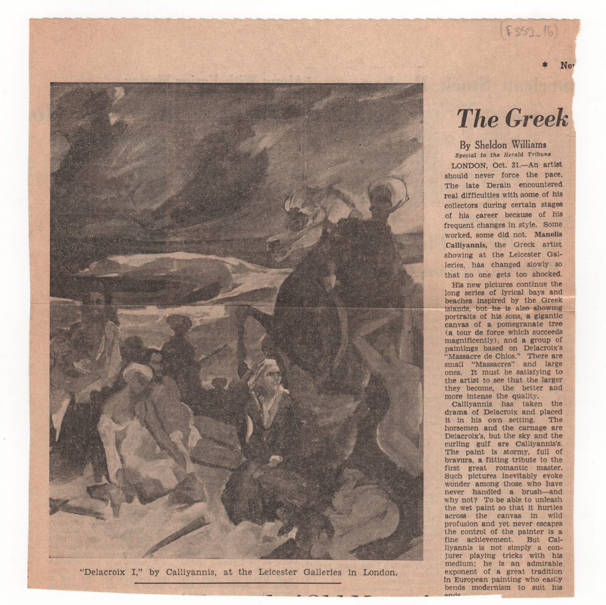 Αποκόμματα εφημερίδας, στα αγγλικά, σε χαρτί, 2 φφ, 21,7×20,34,4×11,5 εκ. Άρθρο του Sheldon Williams για την απεικόνιση των ελληνικών νησιών από το ζωγράφο Μανώλη Καλλιγιάννη. Εικονογραφείται με αναπαραγωγή έργου.