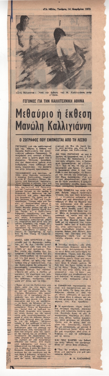 Απόκομμα εφημερίδας, στα ελληνικά, 34,0×11,0 εκ. Άρθρο του Φ. Ν. Κλεάνθη για την επικείμενη έκθεση του Μανώλη Καλλιγιάννη στην Αθήνα το 1973. Εικονογραφείται με αναπαραγωγή έργου.