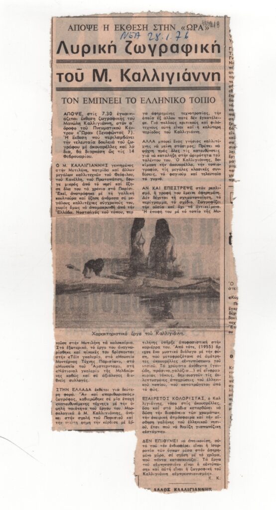 Απόκομμα, έντυπο, στα ελληνικά, χαρτί, 28,4×11,0 εκ. Άρθρο του Κ.Κ. για την επικείμενη έκθεση του Μανώλη Καλλιγιάννη στην Αθήνα το 1976. Εικονογραφείται με αναπαραγωγή έργου. Πάνω από τον τίτλο επιγραφή με τα στοιχεία δημοσίευσης.