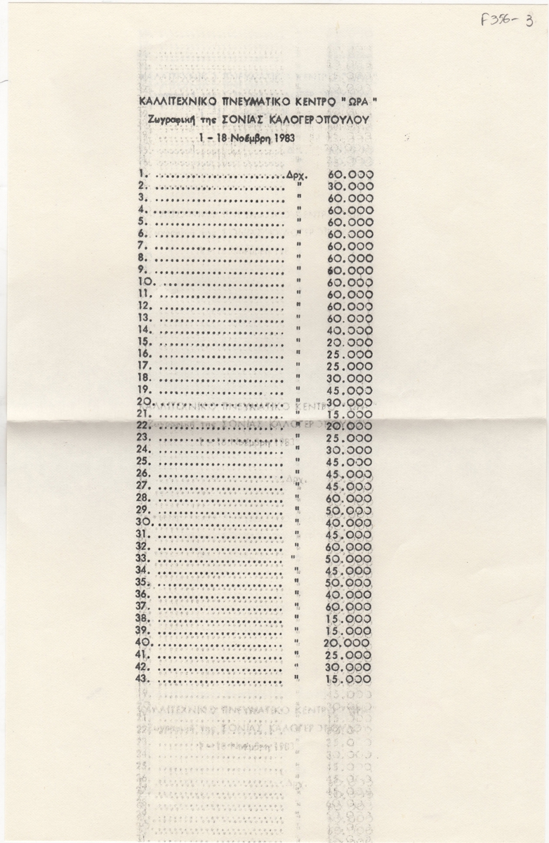 Τιμοκατάλογος, χαρτί, 34×22 εκ., στα ελληνικά, έργων ατομικής έκθεσης ζωγραφικής της Σόνιας Καλογεροπούλου, η οποία διεξάγεται στο Καλλιτεχνικό Πνευματικό Κέντρο Ώρα, το Νοέμβριο 1983.